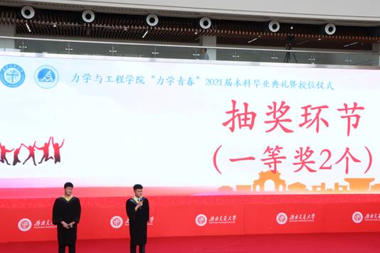 典礼中,老师们还以抽奖的形式为毕业生同学们送出了学院贴心准备的幸运大奖,为大家送上一份好运。两位一等奖得主还上台谈了在交大力学的学习体会,感谢学院和老师们的辛勤栽培。