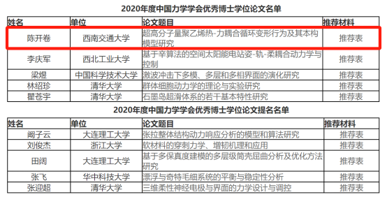 第五届(2020年度)中国力学学会优秀博士学位论文评审于7月16日完成,评选对象为2018年9月1日至2020年8月31日期间在中国获得力学学科相关专业博士学位获得者的学位论文。根据《中国力学学会优秀博士学位论文评选条例》,通过单位或理事推荐、同行专家初评、候选论文公示、评审委员会复评等程序,共有5篇论文入选优秀博士学位论文、5篇获优秀博士学位论文提名。力学学院康国政教授指导的博士毕业生陈开卷的论文《超高分子量聚乙烯热-力耦合循环变形行为及其本构模型研究》获此殊荣,入选中国力学学会优秀博士论文。