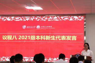 2021级博士研究生胡冰晖代表研究生新生发言。她希望大家都应该脚踏实地,敢于创新。百学须立志,明确的志向指引我们前行的方向。作为研究生,我们不应该被短时间的功利和浮躁所误导,而要树立高远的人生志向。“淡泊以明志、宁静以志远”,静心科研,努力学习科学文化知识,为推动社会前进贡献自己的力量。