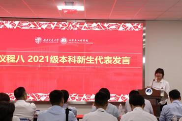 来自2021-01班的赵依然和2021-03班的魏淋杰作为本科生新生代表上台发言。