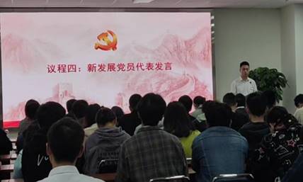 然后,新发展党员代表周德龙同学发言,他从力的三要素:大小、方向和作用点三个方面讲述了他对学生党员“先锋力行动”的理解,他表示:作为学生党员,要围绕思想先锋、学业先锋、服务先锋、生活先锋以及综合先锋这五个方面,从自身抓起,从小事做起,为学院、同学服务,以实际行动发挥党员的先锋模范作用。