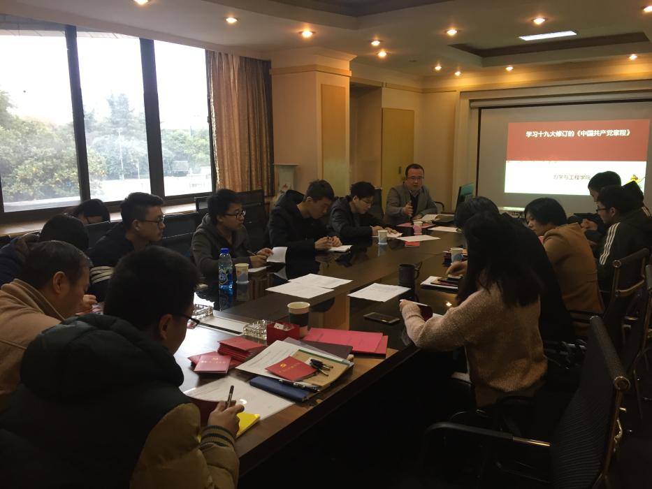 为深入推进“两学一做”学习教育常态化制度化,深入学习和贯彻党的十九大精神,11月30日下午16:00,在九里校区1号综合楼222会议室,力学学院党委组织学院全体教职工和学生党支部书记以及入党发展对象,深入学习新党章。