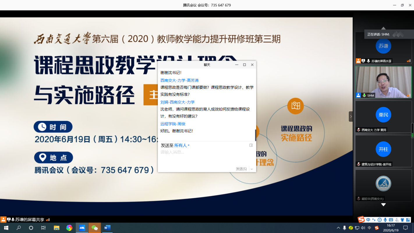 全体参会人员不时提出问题与沈火明教授进行互动和探讨,厘清了对课程思政建设的认识,明确了今后的方向和实践策略,他们感慨沈教授的报告案例丰富,干货满满,自己获益良多。