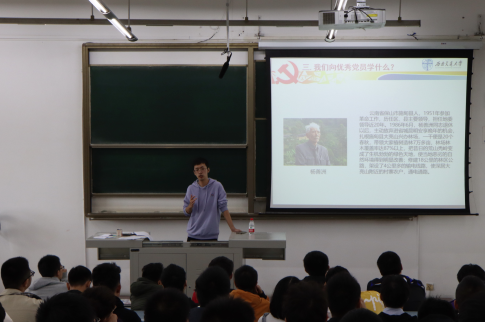接着,胡持老师通过杨善洲、郭明义等优秀的共产党员光荣事迹,展现了党员是如何将“为人民服务”宗旨践行到实际生活中,同时介绍了学生党员先锋模范作用的发挥事例,引发了同学们对“我们应该向共产党员学习什么”问题的思考。