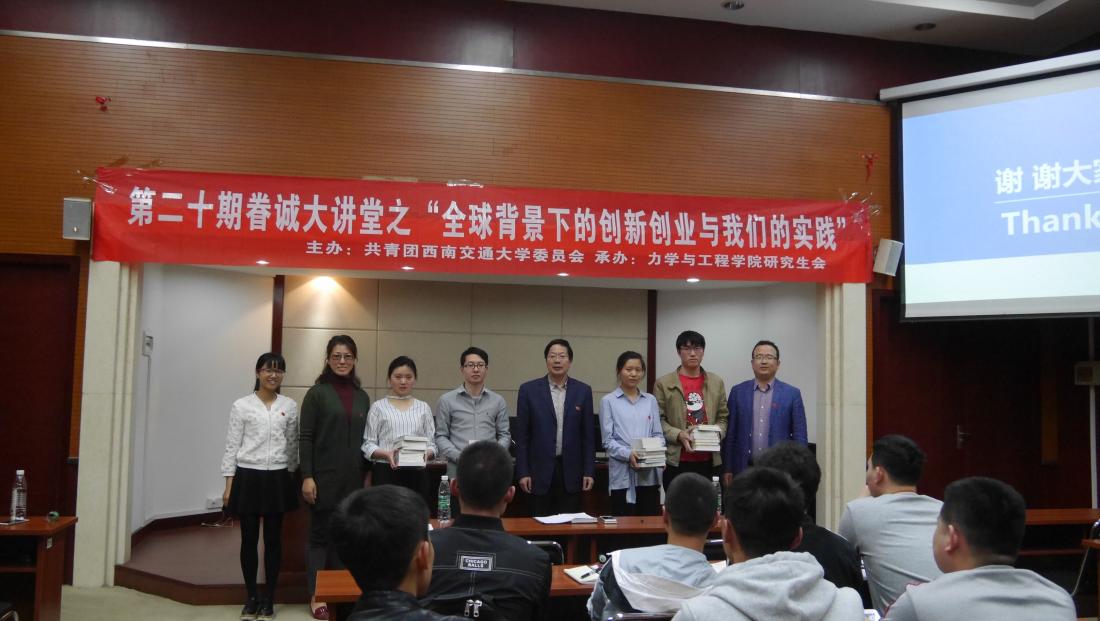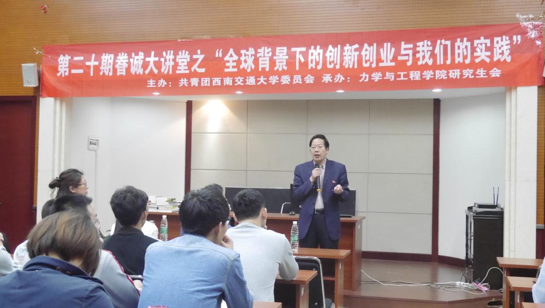 4月20日下午5时,力学与工程学院承办的第二十期眷诚大讲堂之“全球背景下的创业创新与我们的实践”活动在九里校区综合楼二楼学术报告厅顺利举行。此次活动由沈火明教授主讲,学院党委副书记张军琪老师、学工组全体辅导员老师和研究生同学们一同聆听。