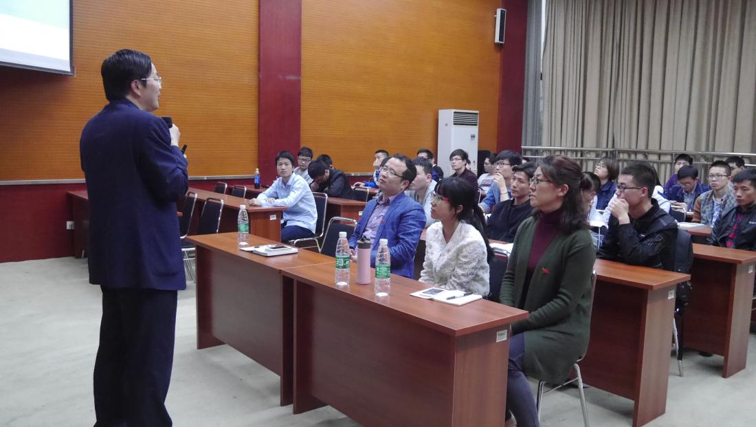 讲座开始,沈火明教授为大家详细介绍了关于《四川省人民政府办公厅关于深化高等学校创新创业教育改革的实施意见》中的总体目标、主要任务,同时也介绍学校在创新创业方面施行的政策和策略,并且阐明了“大众创业,万众创新”已经上升为国家的战略高度,需要大家一起努力。