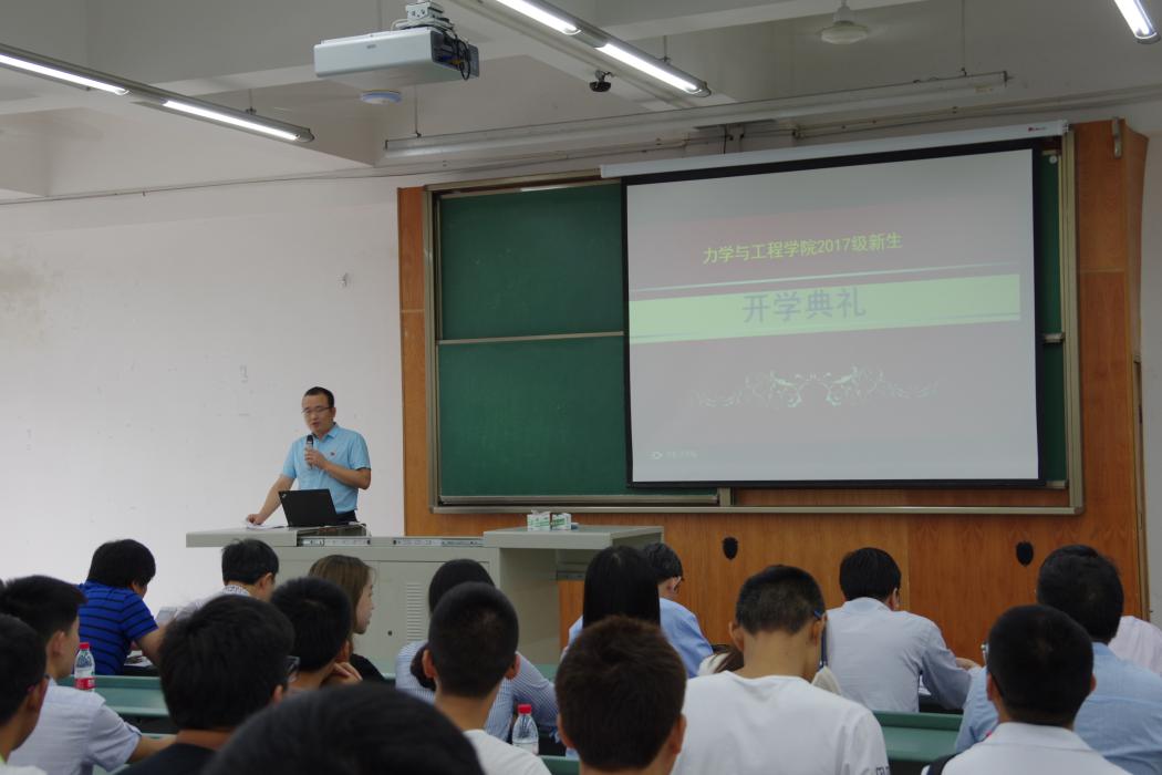 首先是学院党委金建明书记对2017级新同学表示欢迎,并代表学院全体教职工表态:同学们的道路并不会孤单,力学院的全体教职工竭尽所能陪伴大家学习、成长。同时提醒新生进入大学新的征程,不同于高中,要学会改变自己,从各方面来适应现在的新环境,更好地提升自己的能力,相信在大学四年的学习生活中打下的基础会为以后的学习或者工作提供源源不断的动力。