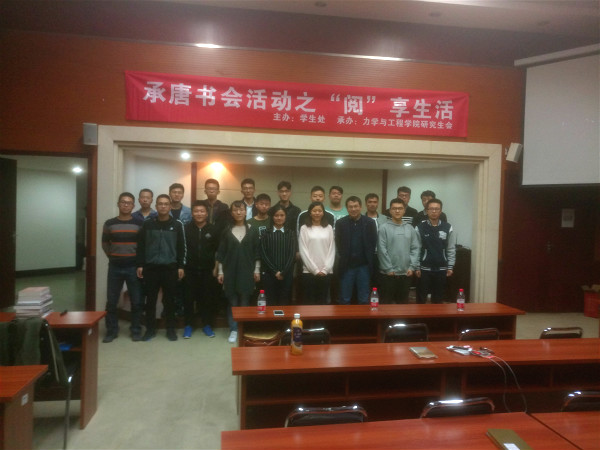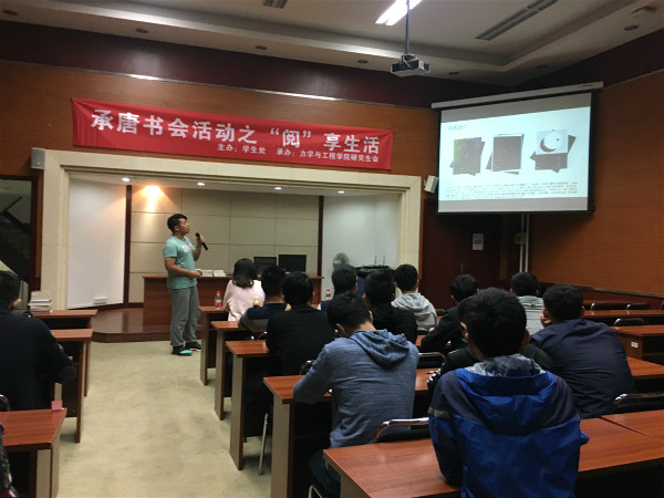 11月9日晚7时,由8827太阳集团官网学生处主办,力学与工程学院研究生会承办的承唐书会之“阅”享生活活动在九里校区综合楼二楼学术报告厅顺利举行。此次活动邀请李翔宇老师、张英蓉老师担任评委,全体研究生一同聆听。