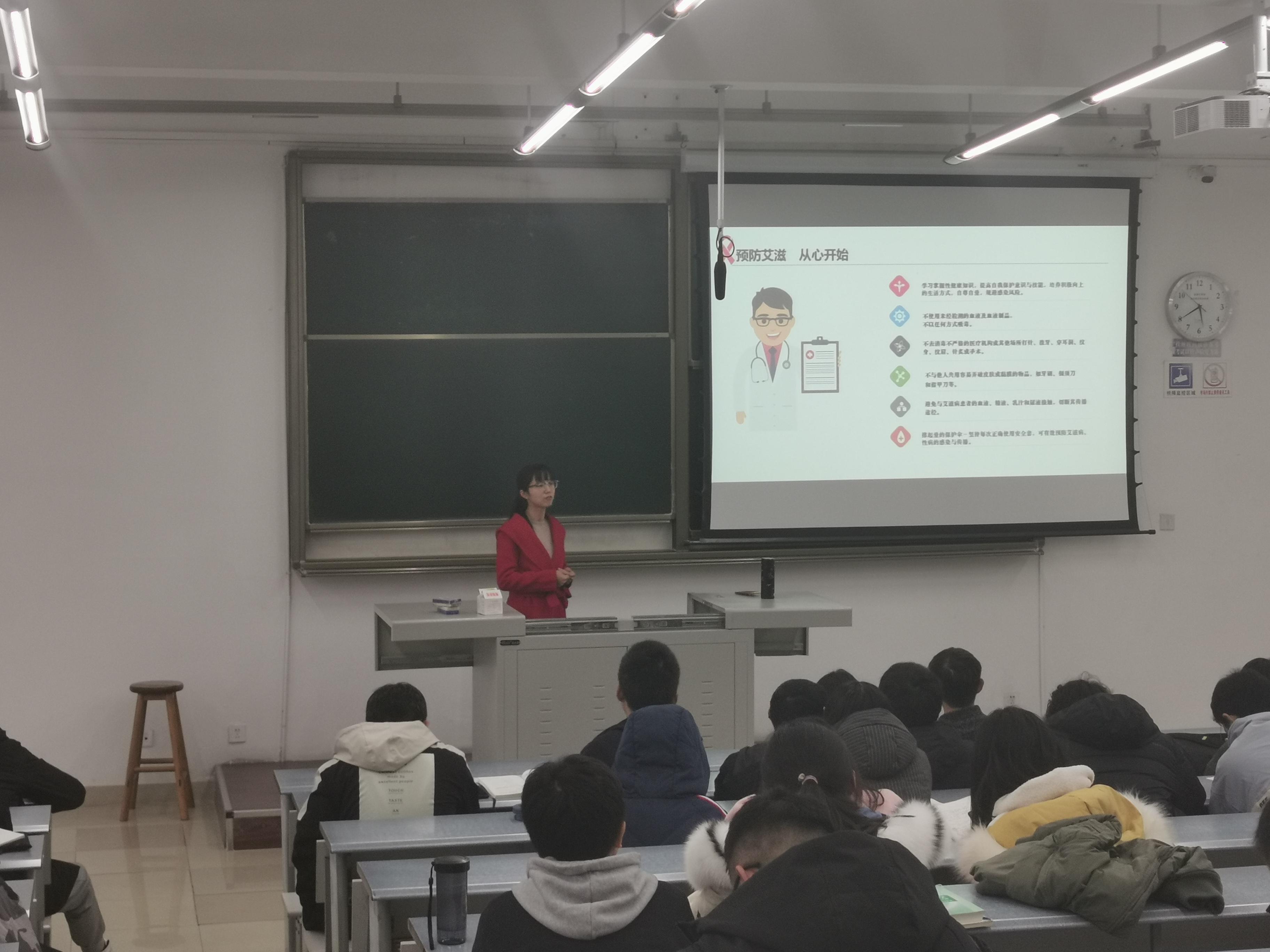 杨婧老师给同学们讲解了什么是艾滋病、艾滋病的感染途径以及预防艾滋病的有效方式,在讲座中,杨老师还通过案例,告诫大家近年来在学校中,学生的艾滋病疫情上升较快,30岁以下青少年人群成为“重灾区”,要求同学们要提高自我保护意识,重视艾滋病的预防。