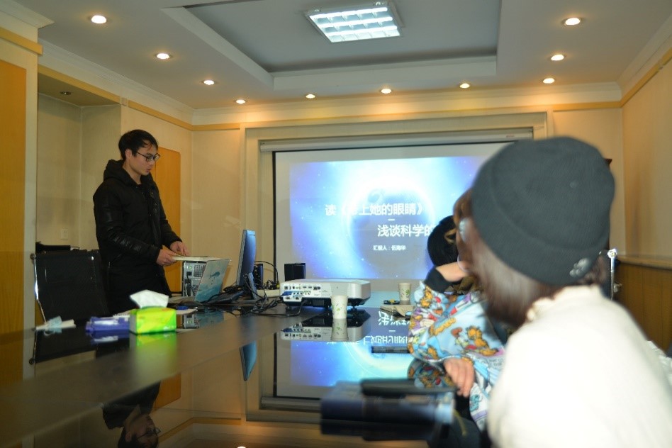 在活动的后半场,伍海华同学分享了他对《带上她的眼睛》这本书的感触,眼睛是心灵的窗户,让你的眼睛探索到这个世界的美好新事物才是最佳选择。接下来刘少杰同学为我们分享了《费马大定理》,17世纪一位名叫费马的业余数学家,巧妙地向同行们留下一个谜题,而解决这个谜题,花费了全世界最高智商人类358年的时间。他提到兴趣如同信仰,是黑暗中的一座灯塔。高智商的人之间,总喜欢玩一些高智商游戏。最后高祥同学分享了大冰的作品《乖,摸摸头》,讲述小人物的平凡而美好的一生。缘深缘浅,缘聚缘散,该分手时分手,该重逢时重逢,惜缘即可,不必攀缘。在分享过程中,每一部作品都能引起听众的共鸣。会后,刘科宏老师对此次读书会作了总结,表达了对展示同学的肯定,希望每位同学都能通过读书去发现生命的美好,体会人生的价值。最后大家一起合影留念记录下此次美好。