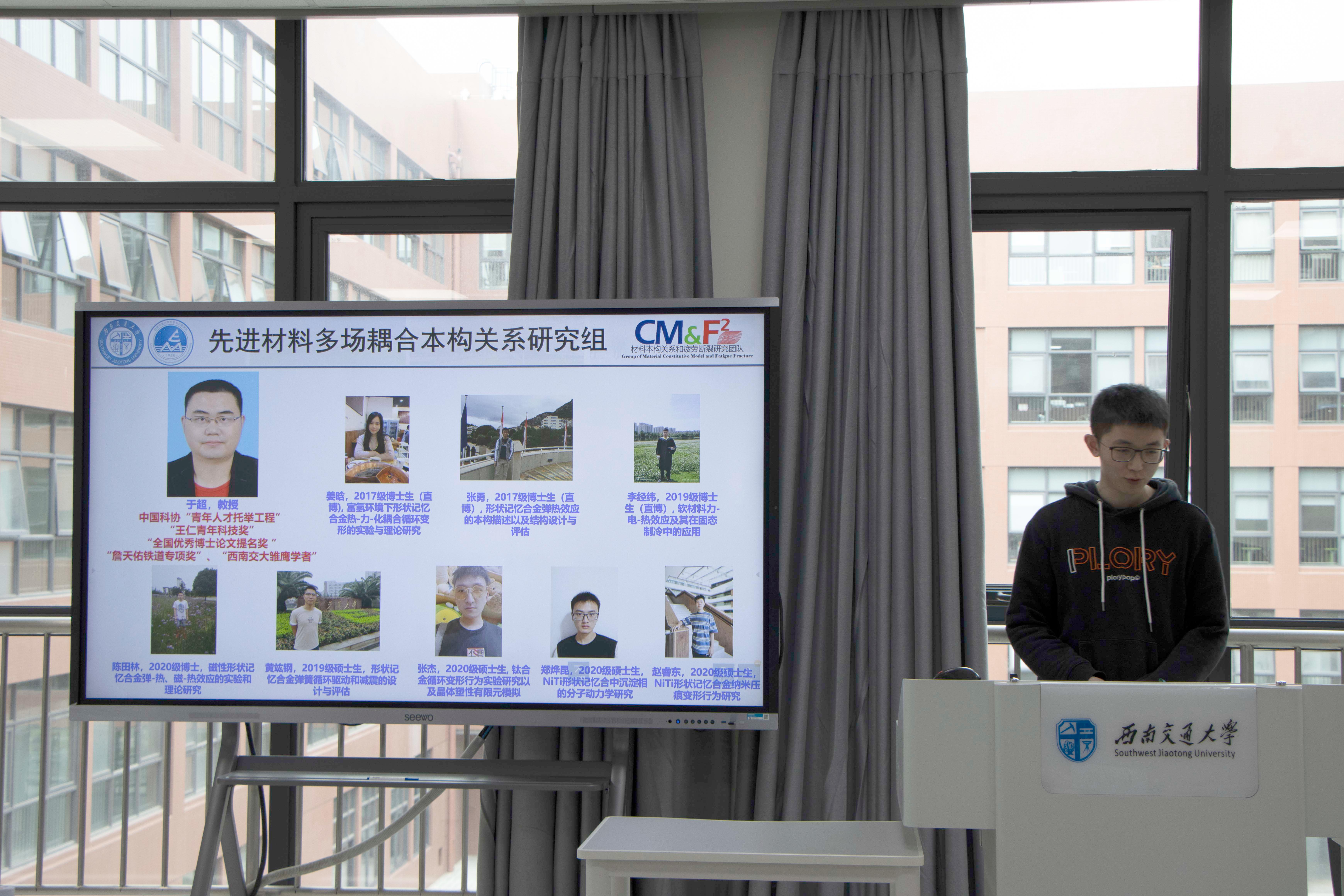 活动第二部分,于超老师团队的张勇博士以“镍钛形状记忆合金弹热效应研究”为题,向大家介绍了其所在团队——先进材料多场耦合本构关系研究小组,并从多铁复合材料制冷的内在原理以及如何调控参数以达到优异的制冷性能详细介绍了新型制冷多铁复合材料系统的弹性制冷性能。他特别指出:科研工作中要抓牢基础知识并夯实基础的有效方法。