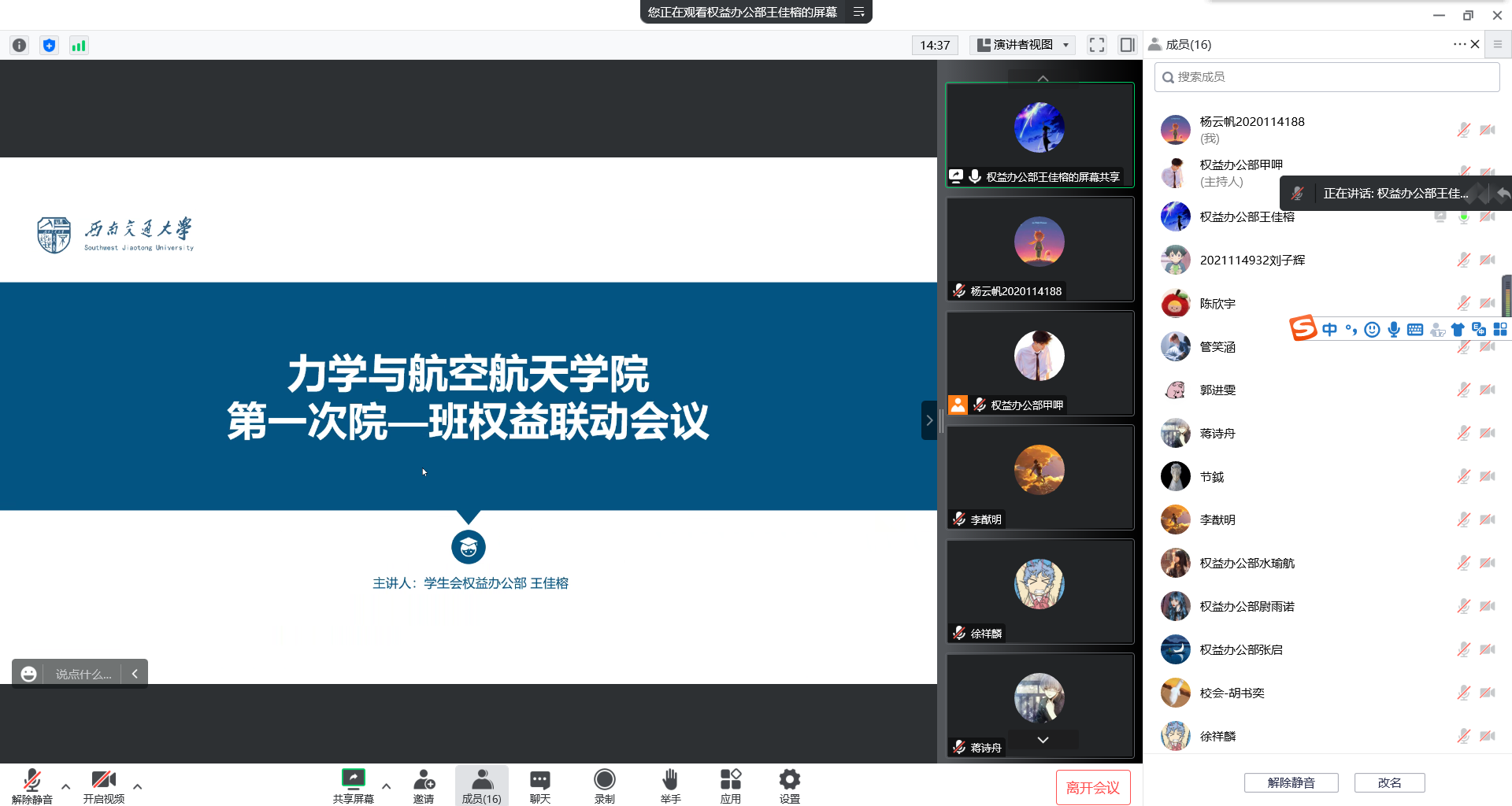 此外,王佳榕同学还在会上介绍了权益工作的处理流程以及各位工作人员的具体分工。其中,收集提案、信息反馈均采用线上线下并行模式,以保证每一个学生的声音都被听见,都能得到有效的回应。