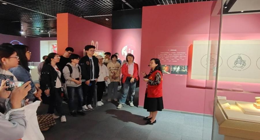 同学们认真参观了“吉祥兔宝——癸卯兔年生肖主题文物展”,讲解员按照“十二生肖有卯兔、长寿吉祥灵兔佑、月满团圆玉兔忙、万家灯火贺今宵”四个展览单元,分别从生肖、相关历史人物、文物、手工、非遗传承等方面依次展开讲解,重点提到“十二生肖时辰双面纹玉圈”和“王建兔首谥宝”以及“康熙十二花卉纹杯”和“桂月共赏双秋镜”等文物。参与人员在听讲结束后,再自由前往其他展厅进行参观,分别参观了工艺品展馆、山水画展馆、少数民族文化馆等多个展馆。