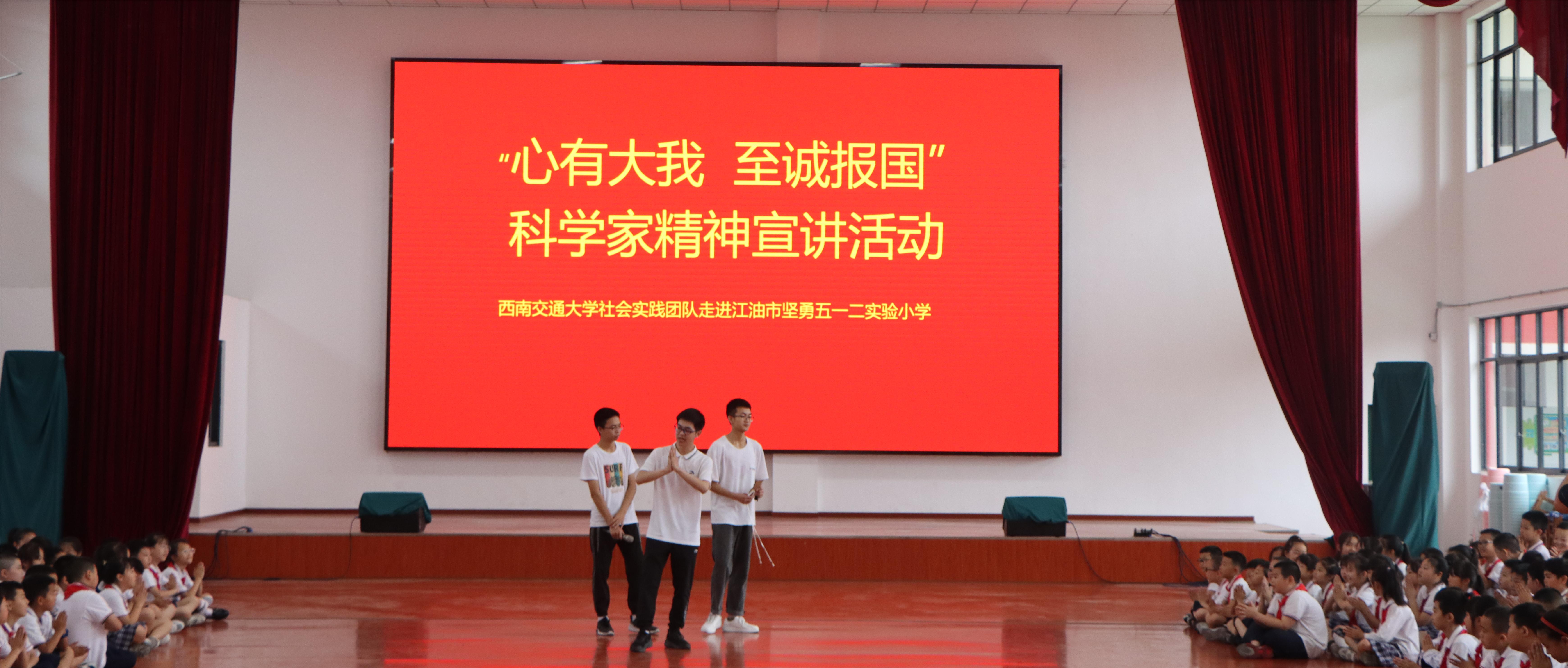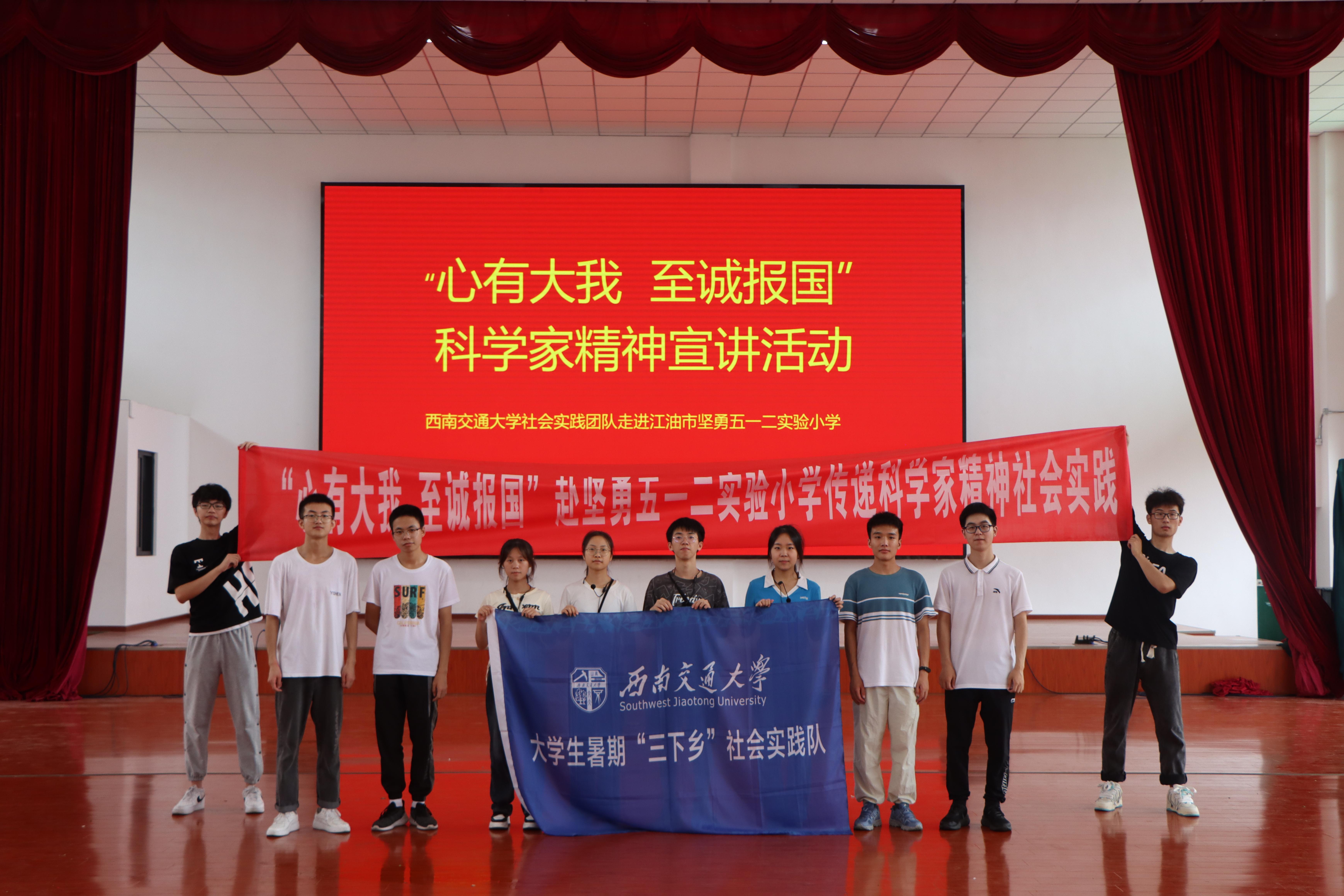 为贯彻落实习近平总书记2020年9月主持召开科学家座谈会时指出的“要大力弘扬科学家精神”指示精神,积极弘扬以爱国主义为底色的科学家精神,8827太阳集团官网组建“三下乡”社会实践队(简称“实践队”),来自工力(拔尖班)2020-01班、工力2022-01班、工力2022-03班和飞行2022-02班的12名同学在辅导员安晟斐的带领下,于7月2日至7月4日赴绵阳江油坚勇五一二实验小学(简称“坚勇实小”),开展以“心有大我 至诚报国”弘扬科学家精神为主题的社会实践活动。活动由教唱科学家歌曲、宣讲科学家精神和开展科学小实验三部分构成。