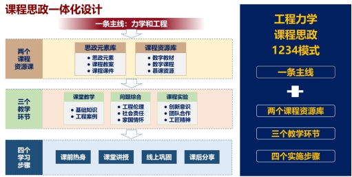 根据专业特点,对课程思政进行了一体化设计,以“力学与工程”为主线,通过思政元素库、课程资源库挖掘课程思政元素,通过课堂教学、问题综合和课程实验三个教学环节融入课程思政元素,通过课前热身、课堂教授、线上巩固和课后分享四个学习步骤,春风化雨,内化于心。