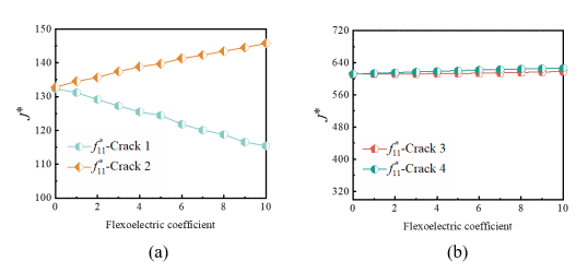不同方向裂纹的J积分 (a)裂纹1和裂纹2 (b)裂纹3和裂纹4