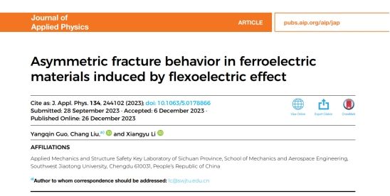 近日,李翔宇教授团队在应用物理领域期刊《Journal of Applied Physics》在线发表了题为“Asymmetric fracture behavior in ferroelectric materials induced by flexoelectric effect”的研究成果。硕士研究生郭阳沁为论文第一作者,刘畅老师为通讯作者。