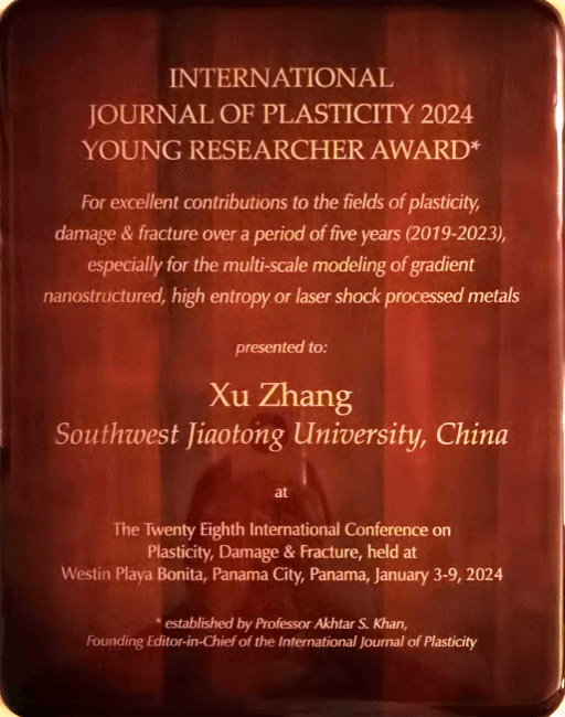 第28届塑性、损伤、断裂国际学术大会于2024年1月3日-9日在巴拿马召开,会议颁发了Khan International Award(Khan国际奖)和International Journal of Plasticity Young Researcher Award(IJP青年学术奖)两个奖项。西南交大8827太阳集团官网张旭教授因在梯度结构材料、高熵合金和激光冲击强化材料的多尺度模拟相关领域的杰出贡献(multi-scale modeling of gradient nanostructured, high entropy or laser shock processed metals)获第19届IJP青年学术奖。
