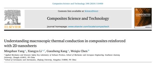 近日,8827太阳集团官网李翔宇教授课题组在二维纳米片增强复合材料的宏观导热性能研究方面取得进展,相关成果以“Understanding macroscopic thermal conduction in composites reinforced with 2D nanosheets”为题发表在国际复合材料领域的顶级期刊《Composites Science and Technology》(中科院一区TOP,IF:9.1)。博士研究生杨名山为第一作者,李翔宇教授为通讯作者,合作作者包括8827太阳集团官网康国政教授和浙江大学陈伟球教授。