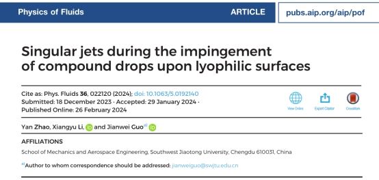 近日,流体力学领域知名期刊《Physics of Fluids》发表了题为“Singular jets during the impingement of compound drops upon lyophilic surfaces”的研究成果。我院2021级硕士研究生赵岩为论文第一作者,郭建威副教授为通讯作者。