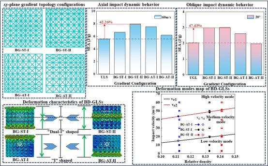为了满足轻质结构在不同冲击方向下的耐撞性要求,刘虎教授课题组展开了系统的研究。提出了一系列具有对称和非对称梯度拓扑构型的双向梯度点阵结构,分析了低速、中速和高速轴向冲击载荷作用下双向梯度点阵结构的变形机理和力学响应。最后,系统地研究了它们在不同冲击方向下在梯度耦合平面上的冲击响应。这些新设计的双向梯度点阵结构既可以利用平行于其梯度方向的加载方向的强度,又可以利用垂直于其梯度方向的加载方向的优势来提高其吸能能力,可为多功能轻量化结构的设计提供参考,提高结构的力学性能和抗冲击性能。