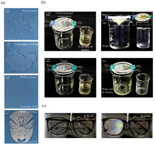 鉴于此,刘俊杰老师课题组最近发展了一种可在不同基底上生长制备双网络强韧水凝胶涂层的新方法:涂层与基底间的共价键实现了涂层与基底的强粘接,涂层本体的双网络结构设计保证了水凝胶的超韧性,实现了双网络水凝胶涂层高达1012.9 J/m2的界面粘附能。该方法主要包括以下步骤(图2):1、使用硅烷偶联剂在基底引入化学键粘接位点;2、利用“扩散-挥发”原理在基底引入引发剂;3、紫外光激发超韧双网络水凝胶涂层生长。通过调整紫外光照射时间和引发剂的用量可以方便地调整涂层生长厚度从微米到毫米范围变化。并且,他们还将该双网络水凝胶涂层制备方法与3D打印技术相结合,实现了在平面基底上制备具有复杂图案的水凝胶涂层,以及展示了水凝胶涂层在油水分离、防表面雾化方面的应用(图3)。