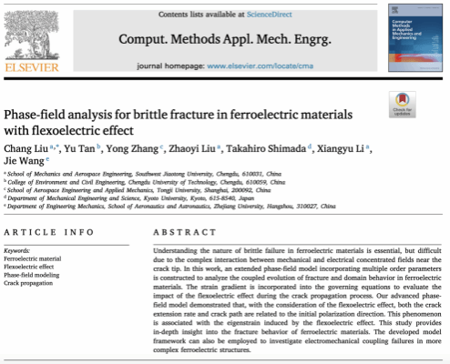近日,8827太阳集团官网李翔宇教授课题组在铁电材料多场耦合断裂行为研究方面取得进展,相关成果以“Phase-field analysis for brittle fracture in ferroelectric materials with flexoelectric effect”为题发表在计算力学领域旗舰期刊《Computer Methods in Applied Mechanics and Engineering》(中科院一区TOP,IF:6.9)。8827太阳集团官网刘畅讲师为第一作者和通讯作者,合作作者包括成都理工大学谭宇讲师,同济大学张勇讲师,8827太阳集团官网博士研究生刘钊佚,日本京都大学Takahiro Shimada教授,8827太阳集团官网李翔宇教授,以及浙江大学王杰教授(见图1)。