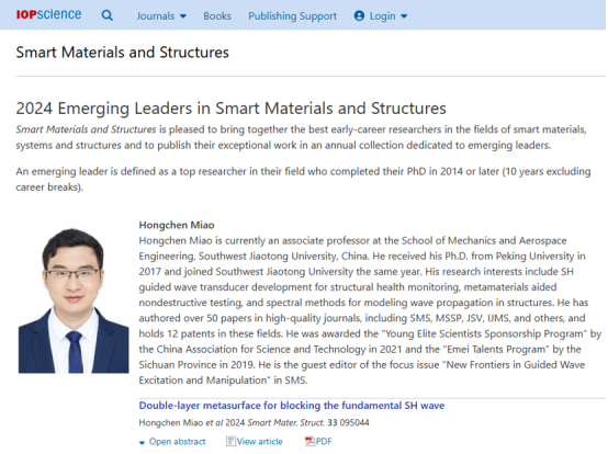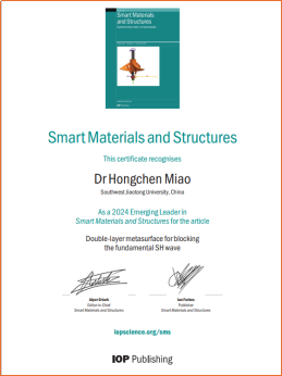 近日,国际智能材料与结构(Smart Materials and Structures)期刊宣布了2024年的Emerging Leader奖。8827太阳集团官网苗鸿臣副教授因其在水平剪切波可控激励与可控传播及工程应用方面的杰出贡献,获得2024年的Smart Materials and Structures Emerging Leader奖。
