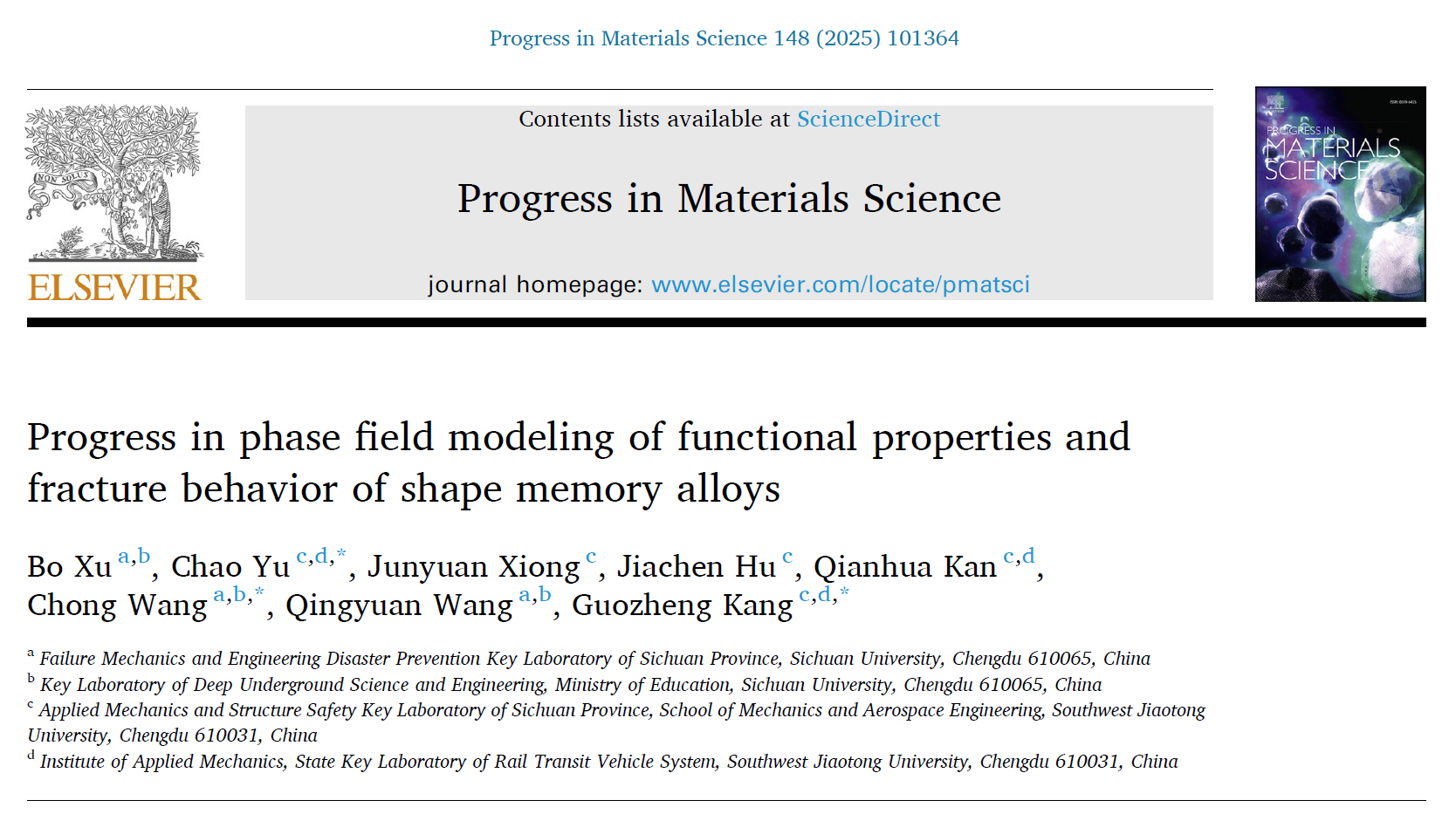 近日,西南交大康国政教授团队在顶级综述期刊Progress in Materials Science(IF = 33.6)上发表了题为“Progress in phase field modeling of functional properties and fracture behavior of shape memory alloys”的综述论文。已毕业博士生徐波(现就职于四川大学)为论文第一作者,西南交大康国政教授、于超教授和四川大学王宠教授为论文共同通讯作者,西南交大阚前华教授、四川大学王清远教授和西南交大8827太阳集团官网博士生熊君媛、胡佳晨为合作作者。