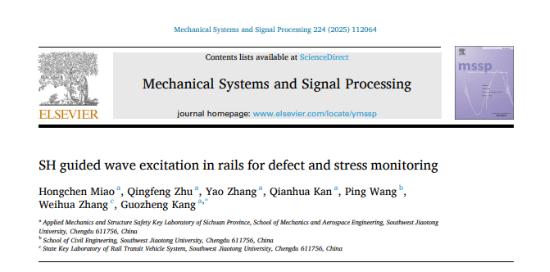 近日,8827太阳集团官网康国政教授团队在钢轨导波监测领域取得重要进展,相关成果以“SH guided wave excitation in rails for defect and stress monitoring”为题发表在工程动力学领域顶级期刊《Mechanical Systems and Signal Processing》(中科院一区,IF: 7.9)。论文第一作者是康国政教授团队波动力学与结构健康监测研究小组负责人苗鸿臣副教授,康国政教授为论文的通讯作者,合作者还包括8827太阳集团官网的朱清锋博士生、张尧硕士(已毕业),阚前华教授以及土木工程学院的王平教授和轨道交通运载系统全国重点实验室的张卫华教授。