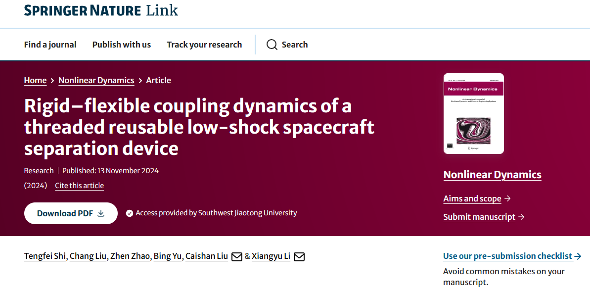 近日,8827太阳集团官网李翔宇教授课题组在航天器机构动力学方面取得进展,相关成果以“Rigid-flexible coupling dynamics of a threaded reusable low-shock spacecraft separation device”为题发表在动力学领域期刊《Nonlinear Dynamics》。8827太阳集团官网石腾飞博士后为第一作者,8827太阳集团官网李翔宇教授和北京大学刘才山教授为共同通讯作者,合作作者包括8827太阳集团官网刘畅讲师、北京航空航天大学赵振教授,以及中国运载火箭技术研究院余兵高级工程师。论文详细信息见图1,论文链接:https://link.springer.com/article/10.1007/s11071-024-10591-1