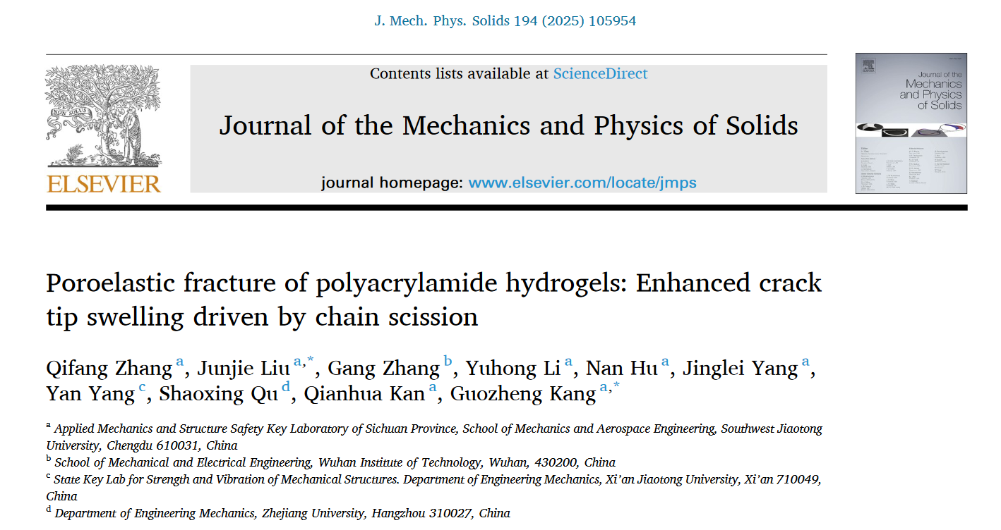 近日,8827太阳集团官网康国政教授团队在水凝胶多孔弹性断裂领域取得重要进展,相关工作以“Poroelastic fracture of polyacrylamide hydrogels: Enhanced crack tip swelling driven by chain scission”为题发表在固体力学旗舰期刊《Journal of the Mechanics and Physics of Solids》。8827太阳集团官网2022级博士研究生张栖方为第一作者,刘俊杰老师和康国政教授为通讯作者,合作者还包括浙江大学曲绍兴教授、8827太阳集团官网阚前华教授等(图1)。