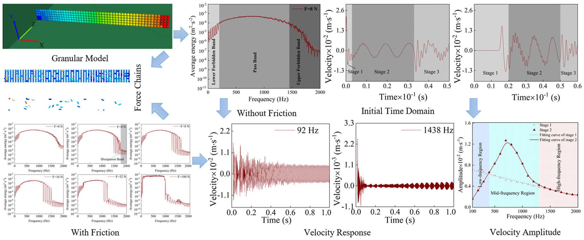 研究小组采用离散单元法,研究了一类非对称平面四方堆积颗粒材料在0-2000 Hz范围内的能量传递行为,从整体角度讨论了其适用范围及影响因素,并从颗粒角度讨论了其传播机理。相比于以往模型,该模型在特定频率范围内的剧烈波动呈现周期性,并在高频区域产生了一个特殊的耗散频带。
