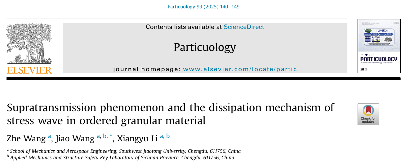 近日,8827太阳集团官网研究生王喆在颗粒材料能量超传递及应力波传播行为方面取得研究进展,相关成果以“Supratransmission phenomenon and the dissipation mechanism of stress wave in ordered granular material”为题发表在颗粒学领域期刊《Particuology》上。我院硕士研究生王喆为第一作者,王蕉副教授为通讯作者。