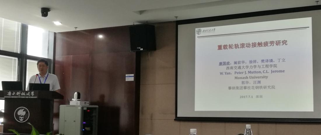 本次青年沙龙由中国力学学会理事会副秘书长、清华大学工程力学系陈常青教授和南方科技大学黄克服教授共同主持。黄克服教授介绍了南方科技大学的发展状况和力学学科现状。应组委会邀请,我院院长康国政教授做了题为“重载轮轨滚动接触疲劳研究”的邀请报告,介绍了研究团队在轨钢棘轮-疲劳交互作用实验、循环塑性和疲劳失效模型、轮轨滚动接触有限元模拟、小曲线半径损伤机理、钢轨廓形优化设计和钢轨延寿措施等课题研究中的进展,引起与会专家学者的广泛关注和讨论。会议自由讨论交流环节,我院青年教师李翔宇教授和张旭副教授介绍了自己的研究方向,与参会的其他青年学者进行了轻松愉快的学术交流。