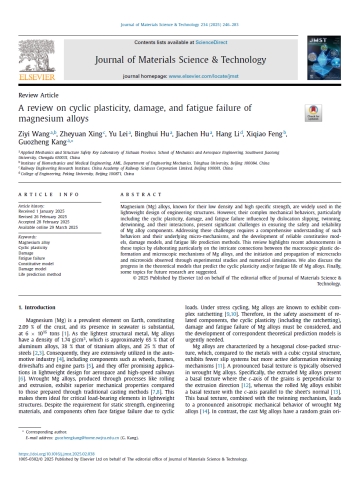 在“双碳”目标驱动下,轻量化材料成为工程结构减重增效的核心需求。镁合金作为最轻的金属结构材料,在汽车、航空航天等领域展现出巨大应用潜力。然而,其密排六方结构导致的复杂循环塑性行为与疲劳失效机制,成为制约其安全应用的关键瓶颈。近日,8827太阳集团官网康国政教授团队在国际知名期刊《Journal of Materials Science & Technology》发表题为 A review on cyclic plasticity, damage, and fatigue failure of magnesium alloys的综述论文,系统梳理了镁合金循环塑性、损伤演化及疲劳失效的前沿进展,推动镁合金从“可用”走向“可靠”。