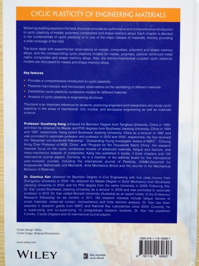 近日,8827太阳集团官网力学与工程学院康国政教授与阚前华副教授受邀由John Wiley & Sons Ltd公司出版了英文专著“Cyclic plasticity of Engineering Materials: Experiments and models”,分七个章节,共538页(ISBN: 9781119180807)。