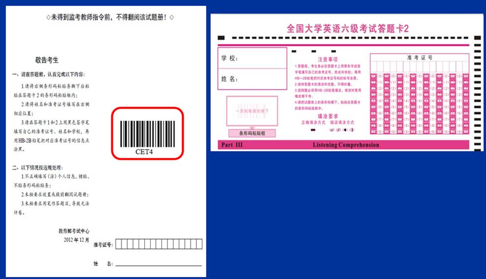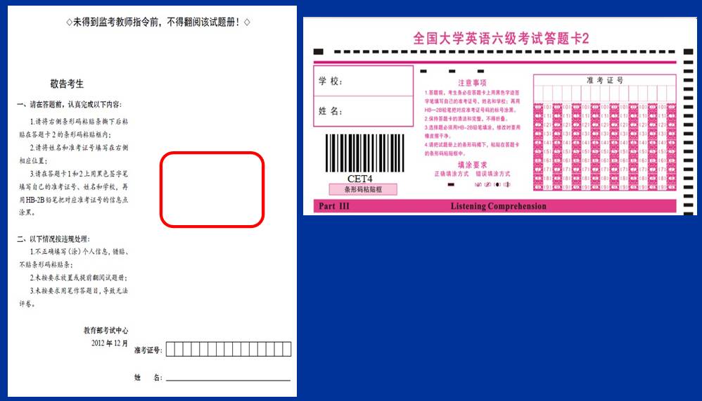 (5) CET4在9时,CET6在15时,监考员将试题册与答题卡1、答题卡2一同下发后,考生除按原有要求填写(涂)答题卡1和答题卡2上相关内容外,须将试题册封底上的条形码揭下后粘贴在答题卡2的条形码粘贴框内,并在试题册封底指定位置填写姓名和准考证号。完成后,考生须将试题册背面向上放回至桌子左上角,不得提前翻阅试题册。