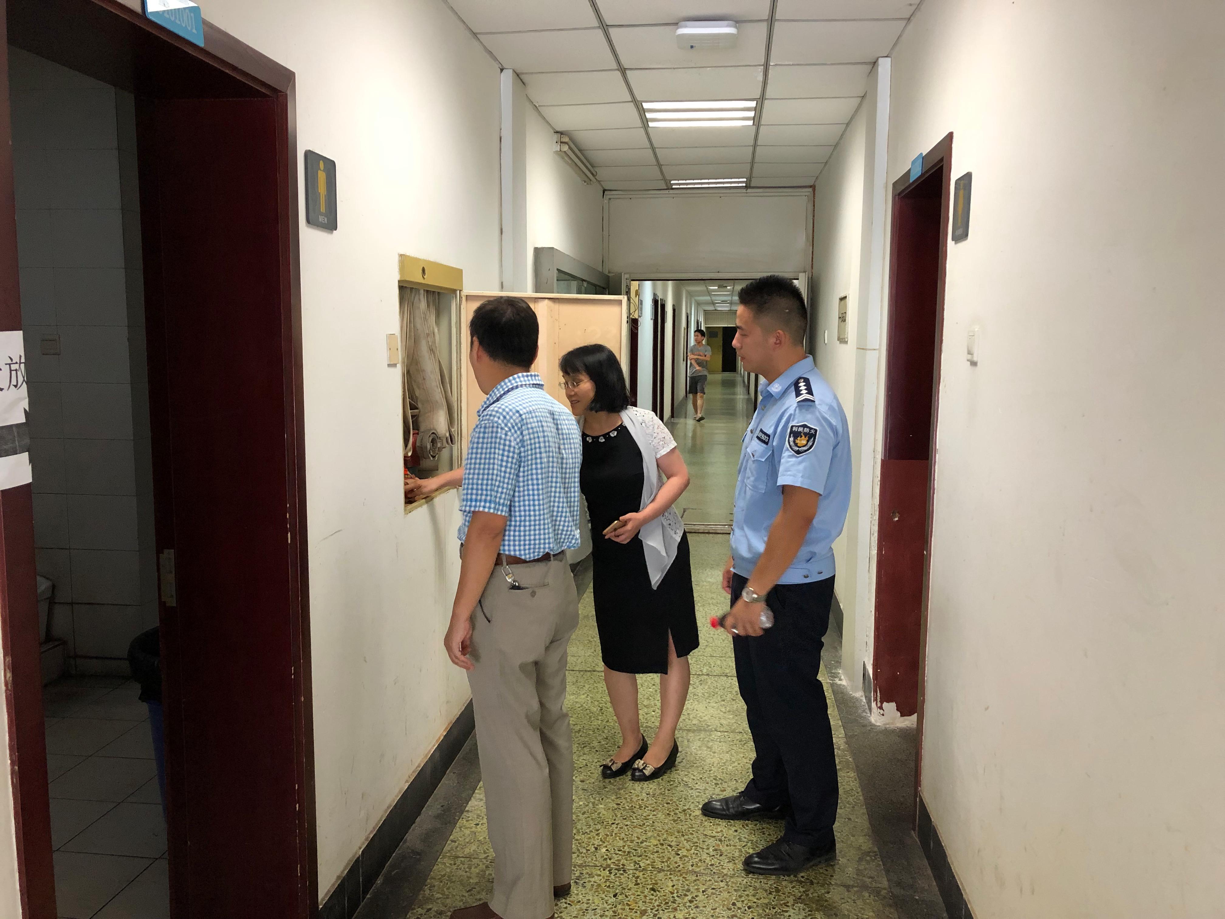 讲座开始前,栗民书记、办公室主任李宗文和张教官一起对学院办公场所、师生工作室等场所的消防安全进行了全面检查,详细查看消防器材是否合格,消防通道是否畅通等。本次检查总体情况良好,但个别环节还存在一定的安全隐患。栗民书记耐心提醒工作室学生,许多火灾都是由插座排插问题引起的,工作室锁门时应当及时切断电源,杜绝火灾隐患。