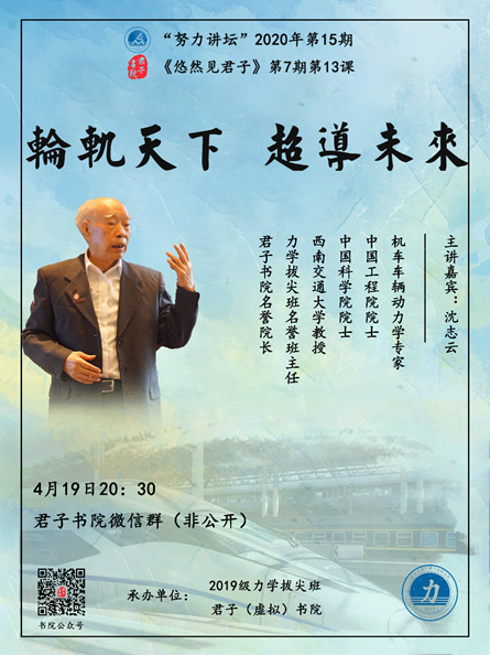 4月19日晚,中国科学院、中国工程院“双料”院士、力学拔尖班名誉班主任、君子(虚拟)书院名誉院长沈志云教授做客“努力讲坛”第15期,与力学学院和君子书院师生们开展了一场题为“轮轨天下,超导未来”的云上讲坛。讲坛在君子(虚拟)书院微信群中举行,力学学院副院长李翔宇、党委副书记孔祥彬等近200名师生参加了讲坛,讲坛由2019级力学拔尖班班长周德龙同学主持。