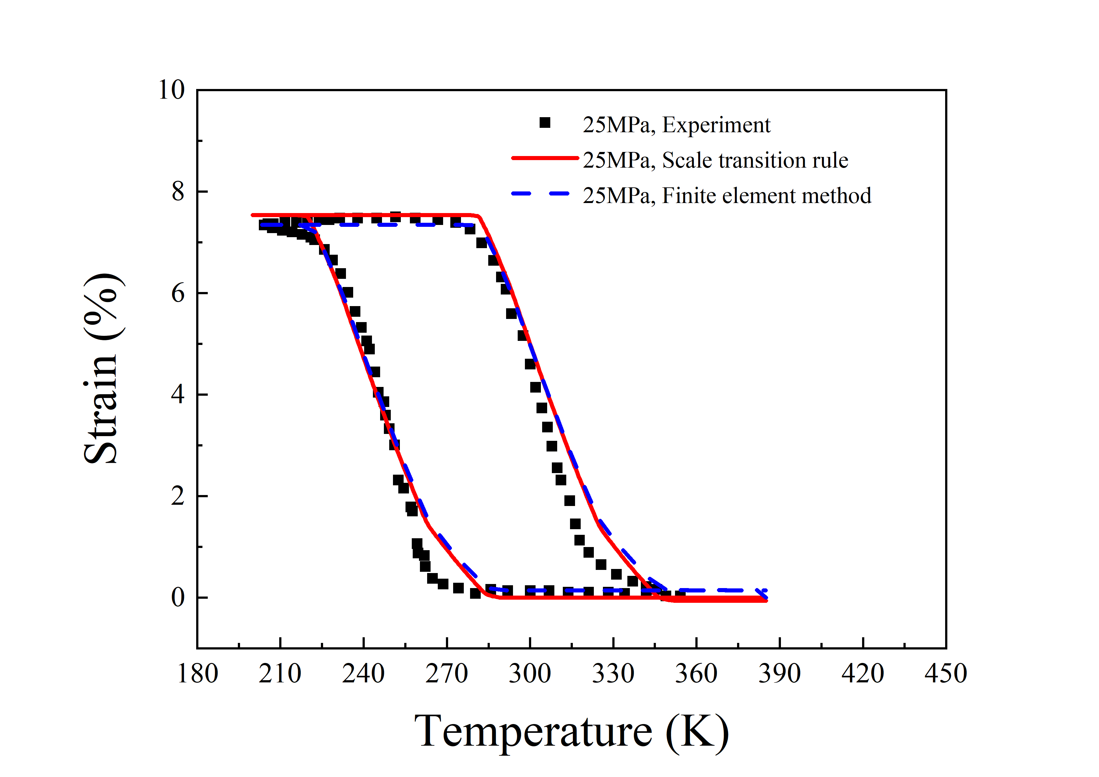 图2 双程形状记忆效应和弹卡效应的实验及理论模拟结果