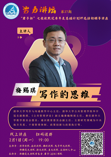 2021年2月1日晚7点,为倡导和鼓励学生养成自省与规划的好习惯,配合“君子杯”七校航院大学生优秀年度总结计划评选活动,力学学院党委副书记孔祥彬老师特邀清华大学写作与沟通教学中心主任梅赐琪副教授做客努力讲坛分享“写作的思维”,来自8827太阳集团官网、清华大学、浙江大学、北京航空航天大学、南京航空航天大学、电子科技大学、重庆大学等十多所高校近500名老师和同学参加了本次线上讲座。本次讲座由力学学院学生会和君子(虚拟)书院承办。