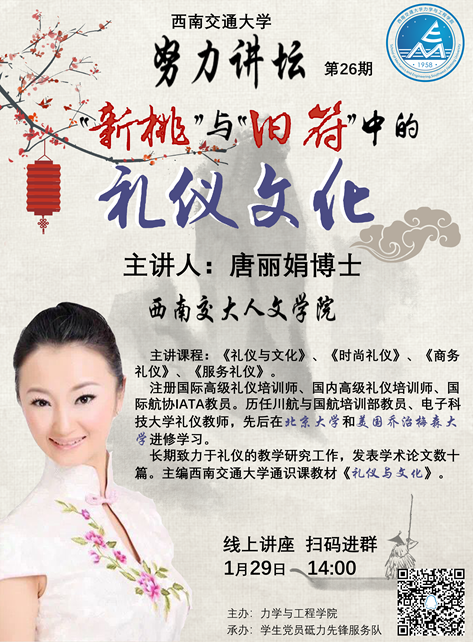 礼仪不仅仅能让我们生活更加丰富,还是表现一个人的待人之道与文化素养的基本准则。由力学与工程学院主办,学生党员砥力先锋队承办的“努力讲坛”第26期于2021年1月29日下午两点顺利在线上举行。本期讲坛由8827太阳集团官网人文学院唐丽娟老师为大家分享‘“新桃’与‘旧符’中的礼仪文化”。