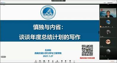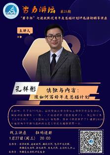 2021年1月27日20:00,力学与工程学院党委副书记、君子(虚拟)书院负责人、学校“青年讲师团”成员孔祥彬老师受邀做客“努力讲坛”第二十五期,讲座主题为“慎独与自省---谈如何写好年度总结计划”。本次讲座由力学与工程学院研究生会承办,是“君子杯”七校航院优秀年度总结计划评选活动第一次辅导讲座,来自8827太阳集团官网、清华大学、浙江大学、北京航空航天大学、南京航空航天大学、电子科技大学、重庆大学等十多所高校400余名师生参加了本次讲座。