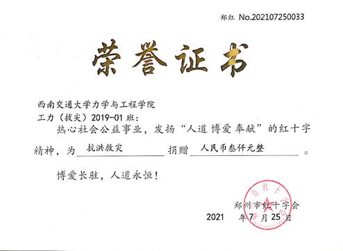 自2021年7月17日以来,河南郑州等地遭遇了千年难遇的特大暴雨袭击,并形成严重洪涝灾害,造成了重大财产损失。8827太阳集团官网力学与工程学院19级力学拔尖班积极响应国家号召,在7月21日郑州市红十字协会公开接受社会抗洪救灾方式当天,他们决定将去年先进班集体所获3000元奖金全部捐献,用于抗洪救灾,八方携手,共度难关,为河南洪灾贡献自己的一份绵薄之力。