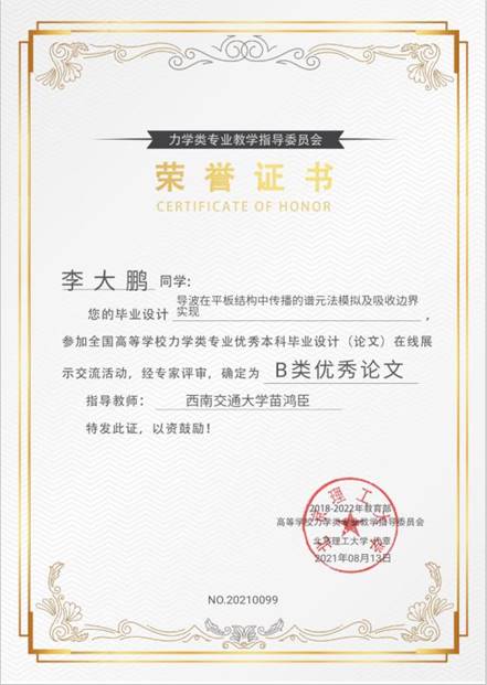 教育部高等学校力学类专业教学指导委员于2021年5月发起第二届全国高等力学类专业优秀本科毕业设计(论文)在线展示交流活动,论文提交采用限额制。本次活动共有146篇符合要求的论文参评,经力学类专业指导委员会评审决定,最终评出A类优秀论文42篇,B类优秀论文70篇。