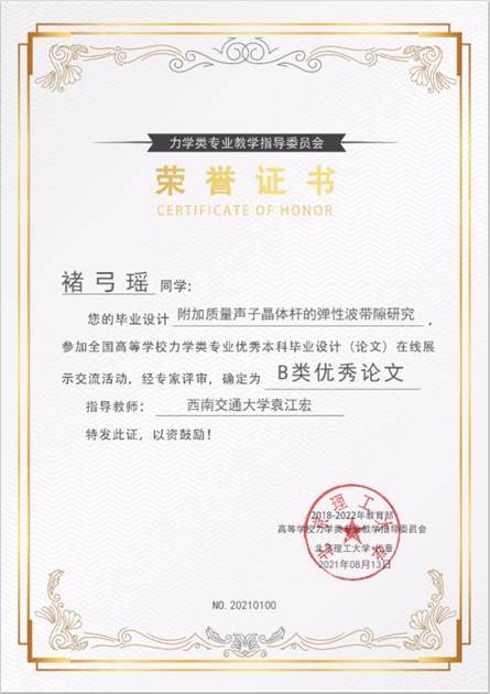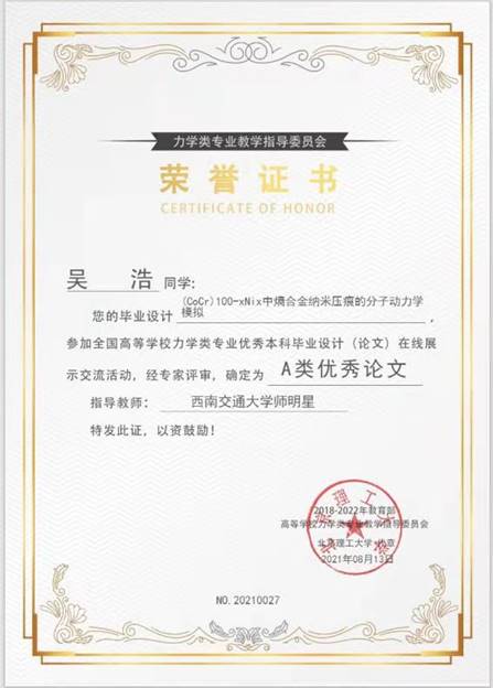 最近教育部高等学校力学类专业教学指导委员会公布了第二届“全国高等学校力学类专业优秀本科毕业设计(论文)在线展示交流活动”获奖情况,我院参与评选的三位同学均获评优秀论文。其中,吴浩同学的本科毕业论文“(CoCr)100-xNix中熵合金纳米压痕的分子动力学模拟”荣获A类优秀论文,褚弓瑶同学的本科毕业论文“附加质量声子晶体杆的弹性波带隙研究”以及李大鹏同学的本科毕业论文“导波在平板结构中传播的谱元法模拟及吸收边界实现”荣获B类优秀论文,他们的指导老师依次为师明星教授,袁江宏副教授以及苗鸿臣副教授。