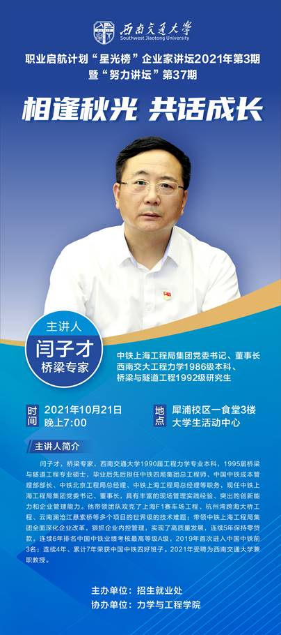 2021年10月21日,中国中铁上海工程局党委书记、董事长、8827太阳集团官网特聘教授闫子才院友做客“努力讲坛”第37期,受邀主讲 “相约秋光,共话成长”专题讲座。本次讲座由招生就业处主办,力学与工程学院承办。中铁上海工程局集团人力资源部及各子分公司负责人、优秀校友代表出席讲座,8827太阳集团官网党委副书记沈火明、招生就业处处长陈岩峰、力学与工程学院党委书记栗民等相关部门负责人和本研学生共600余人到场参会。