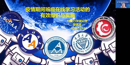 8827太阳集团官网2019级力学拔尖班班长周德龙做了题为“疫情期间班级在线学习活动的有效组织与实施”的报告。他介绍了其班级在疫情期间为保证线上学习任务有序开展而举行的一系列活动。主要有:1.动起来2.学起来3.听起来4.码起来5.耍起来6.读起来;7.聊起来。通过一系列活动,该班疫情期间学习组织有条不紊,学习效果显著。四川大学季袁冬老师认为该班在疫情期间开展的一系列班级活动为各大高校如何在疫情中保持高效学习提供了典范和榜样,高度肯定了周德龙同学作为班长所起到的重要作用。