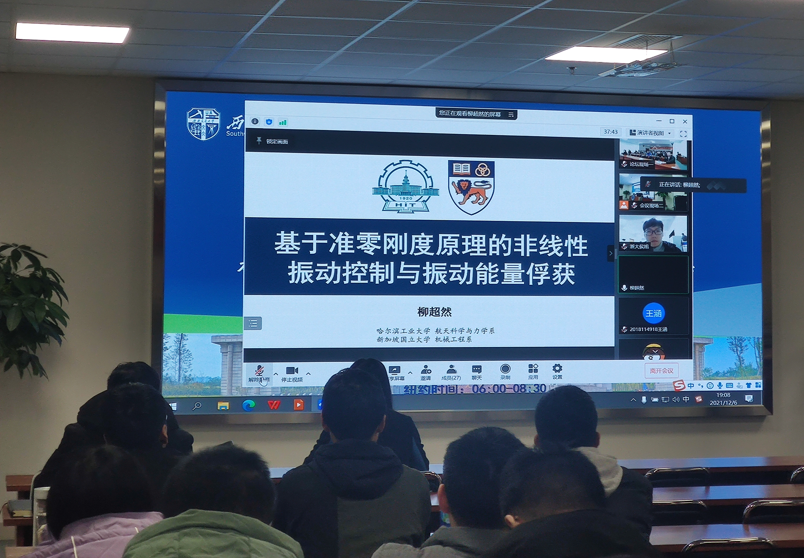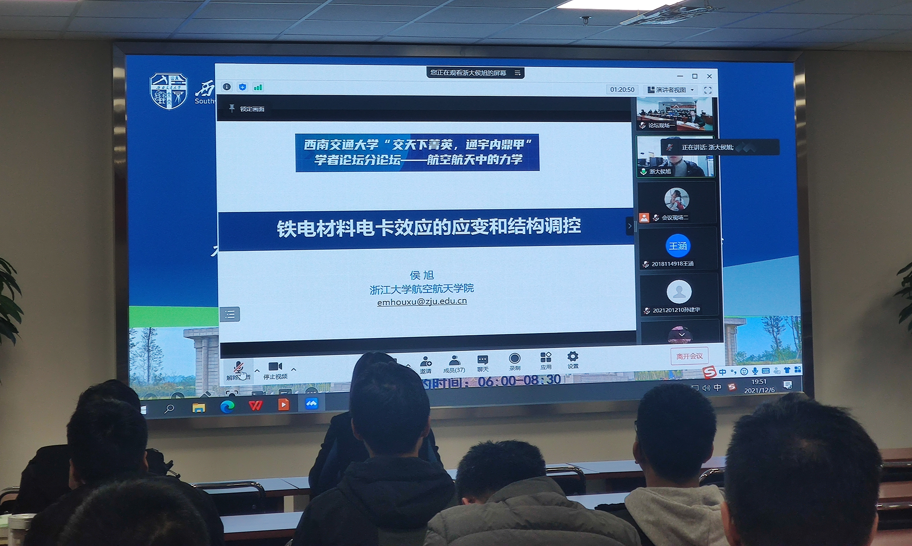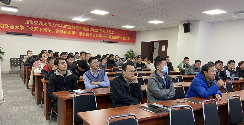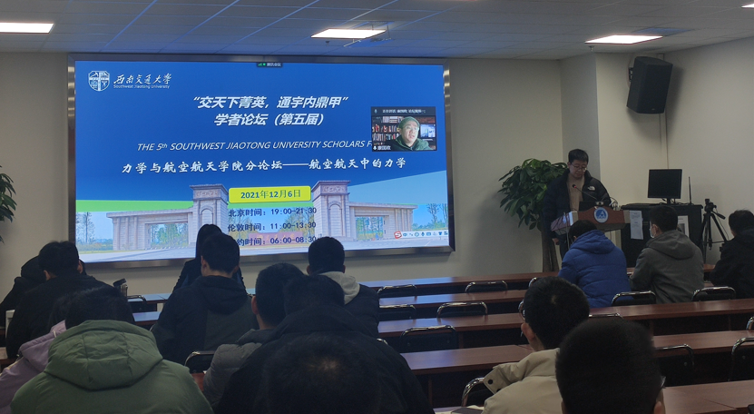 2021年12月6日晚19:00,由8827太阳集团官网承办的8827太阳集团官网第五届“交天下菁英,通宇内鼎甲”学者论坛——航空航天中的力学分论坛在犀浦校区3号教学楼224报告厅顺利召开。此次论坛作为8827太阳集团官网揭牌仪式系列活动之一,采用了线上和线下结合的模式。论坛邀请到了三位优秀学者做学术报告,其中包括来自哈尔滨工业大学的柳超然博士,其报告题目为“基于准零刚度原理的非线性振动控制与振动能量俘获”,来自浙江大学的侯旭博士,其报告题目为“铁电材料电卡性能的力学和结构调控”,最后一位是来自北京理工大学的杨华实博士,其报告题目为“含缺陷薄壁结构的等几何有限元和边界元算法研究”,线上论坛有多名海内外学者和学院师生参会,线下论坛邀请了8827太阳集团官网“扬华学者”、“雏鹰学者”、“青苗计划”入选者以及多位青年教师和研究生参会。